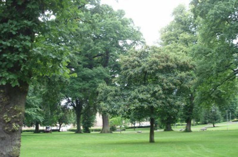 Parkens trekantede areal er omskærmet af lave voldlignende mure, der omkranser det slyngede forløb af store rododendronbuske.